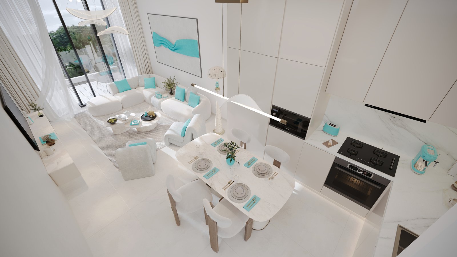 - he apartments offer high-end kitchen finishes with marble surfaces, built-in appliances, modern cabinetry, and an open-concept dining area.